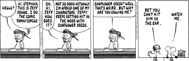 Pearls Before Swine: I'm afraid one of my characters, "Jeffy," keeps getting hit in the nose with sunflower seeds.